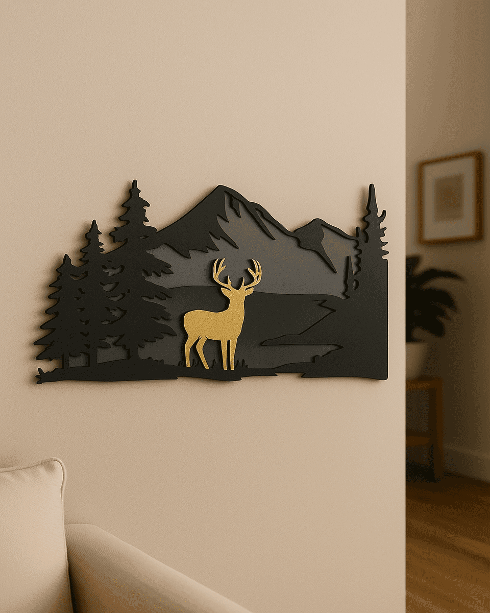 The combination of matte black trees and mountains with a gold-finished deer centerpiece creates a stunning contrast that enhances any room’s aesthetic. The layered design gives the artwork a sense of depth, while the subtle gold detailing adds sophistication and warmth.