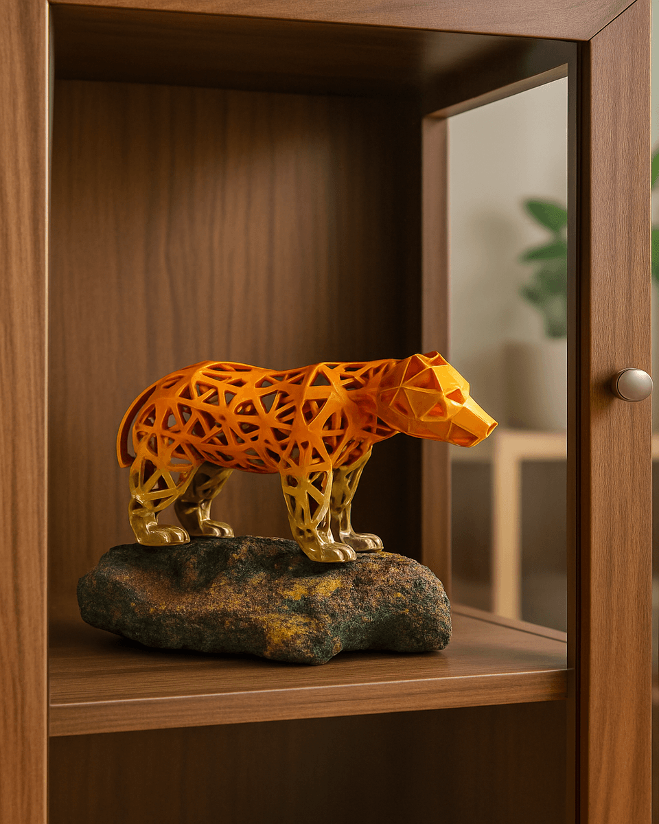 The sculpture rests securely on a real stone bottom or solid wood base (variant options available). This not only adds durability but also enhances the natural appeal of the piece. The rugged stone contrasts beautifully with the smooth, angular bear design, symbolizing the coexistence of raw nature and modern artistry.