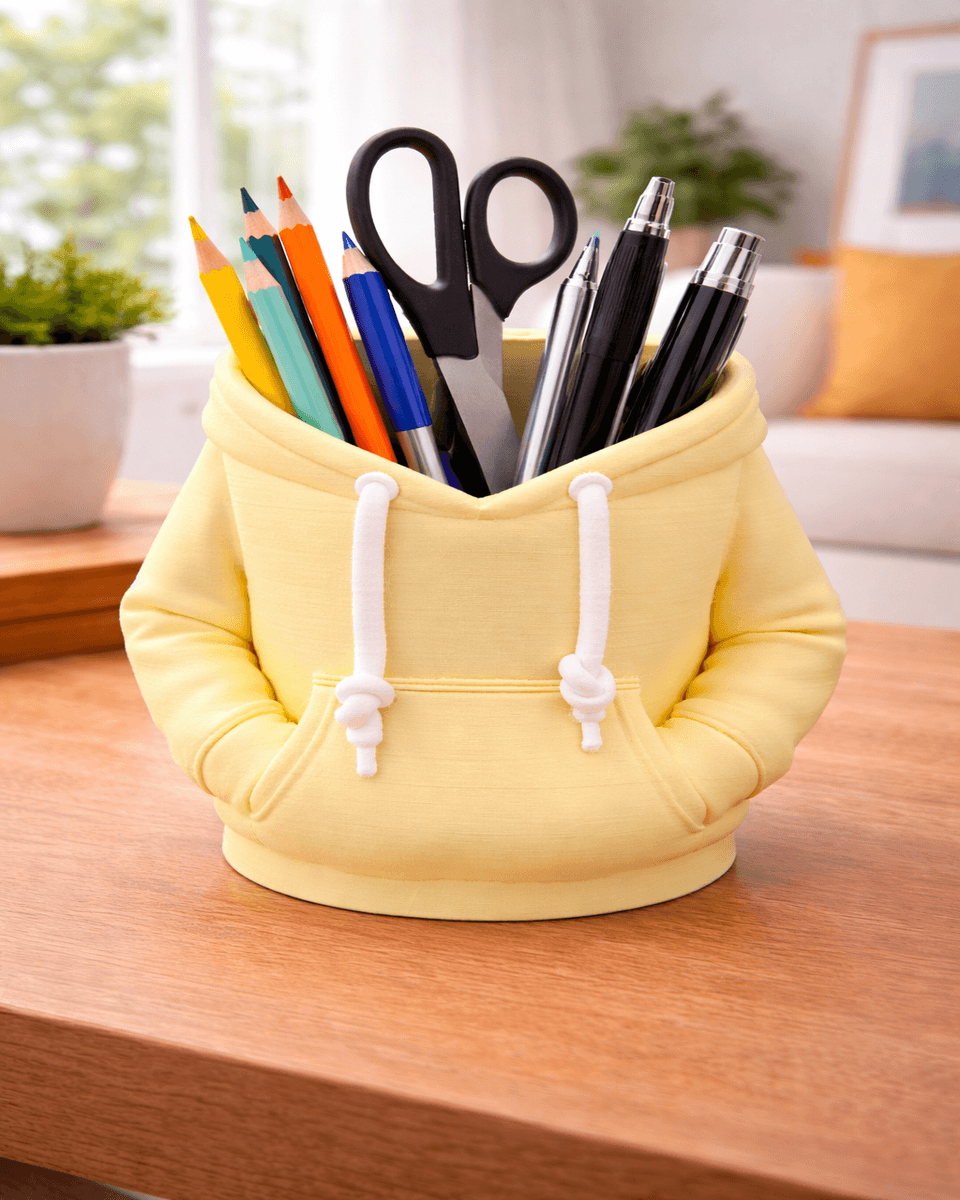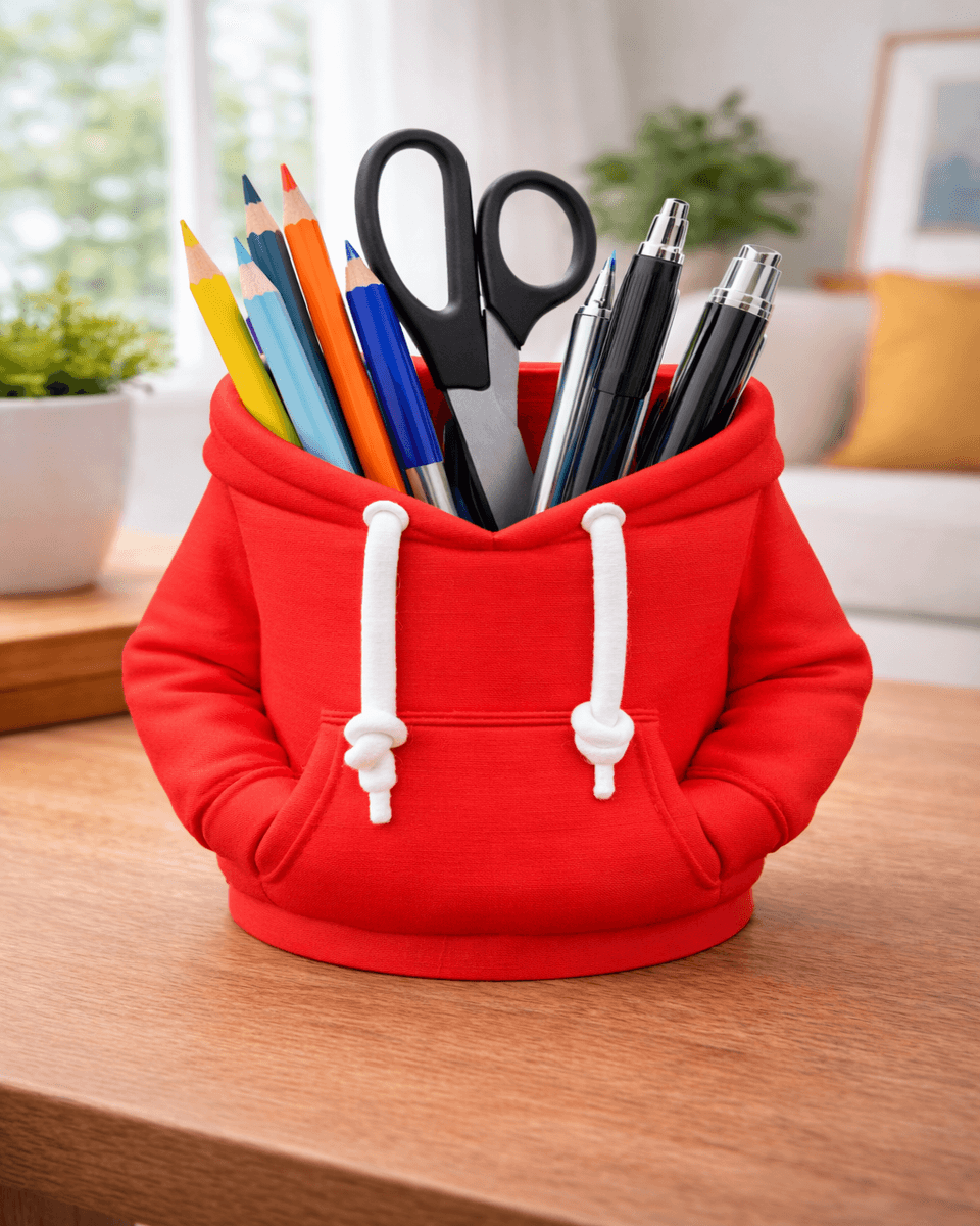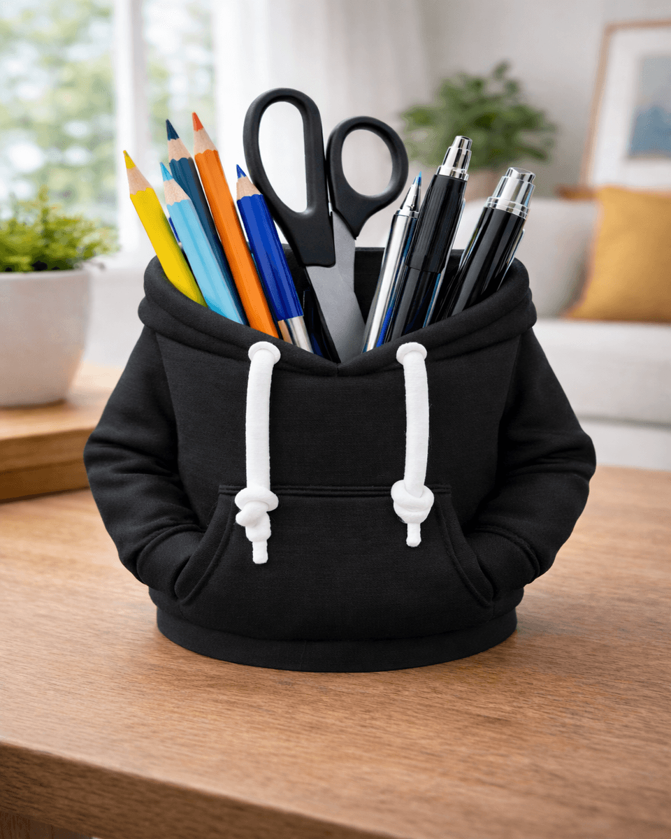 Ditch the boring plastic cups and give your stationary a comfortable place to rest with the Hoodie Helper Desk Caddy. This unique organizer is designed to look exactly like a classic drawstring hoodie, complete with realistic fabric-like textures, a front “kangaroo” pocket, and white drawstrings. It’s a perfect blend of playful fashion and functional desk utility.